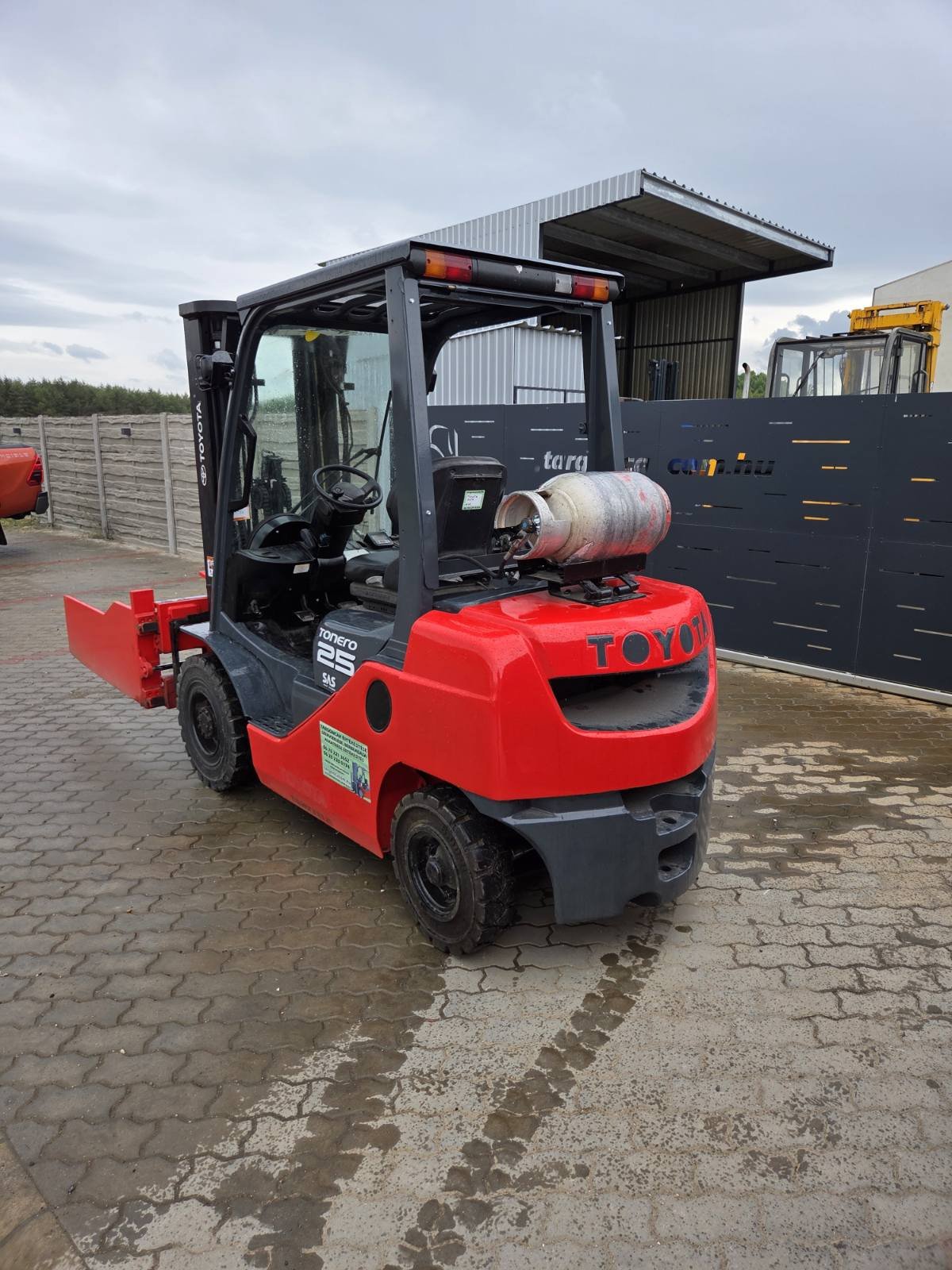 Eladó Toyota 8FGF 25 típusú gázüzemű targonca, 2,5 t teherbírás, 4,75 m emelési magasság, 1,6 m szabademeléssel, Toyota motorral, bálafogó adapterrel, oldalmozgatóval, munkalámpával, kitűnő állapotban. ((T51)